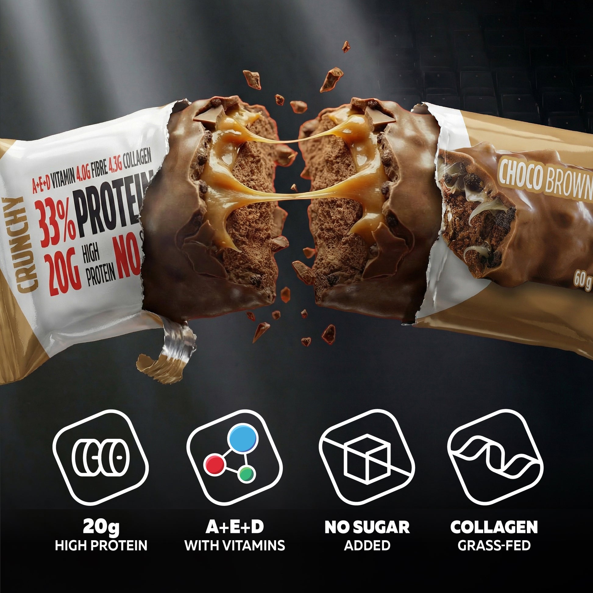 CRUNCHY Choco Brownie is your go-to protein bar—keeping the same irresistible brownie taste, now upgraded for smarter, more functional nutrition. The upgrade is exactly where it matters: in the details that make the formula cleaner, more purposeful, and better suited to an active, modern lifestyle.
