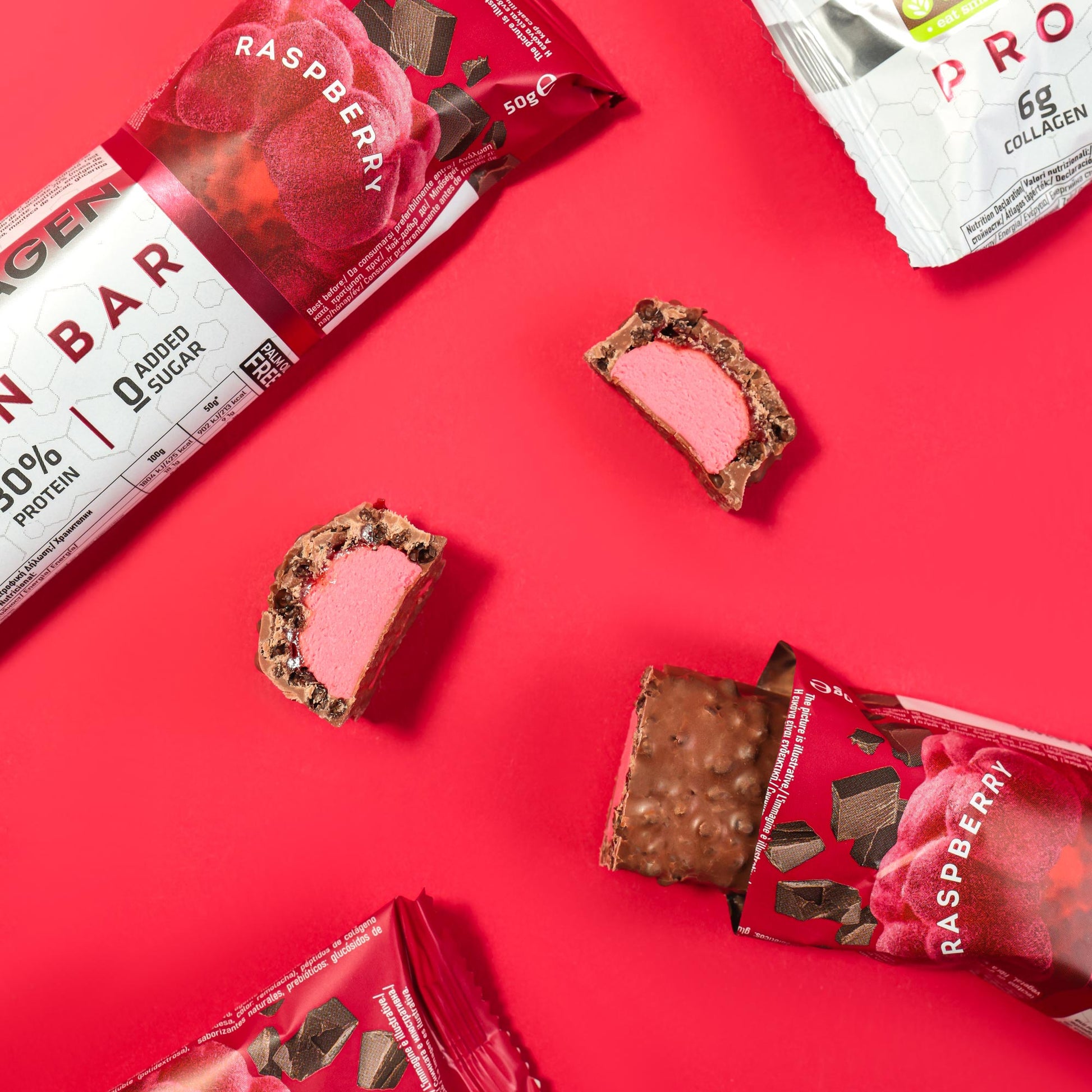 RiceUP! The collagen bar is a new generation functional dessert that does not compromise on taste and fits under 215 calories, making it the ideal snack for those who monitor their calorie intake. It is a magical combination of textures, flavor, and functionality that promises delight with every bite! It combines a gentle protein filling with raspberry flavor, a layer of raspberry cream, no added sugar, and fine cocoa crisps, wrapped in real milk chocolate, without palm oil. The collagen bar contains 6000mg of hydrolyzed beef collagen type I and III. Collagen is the key component in the RiceUP! Collagen Protein Bar.