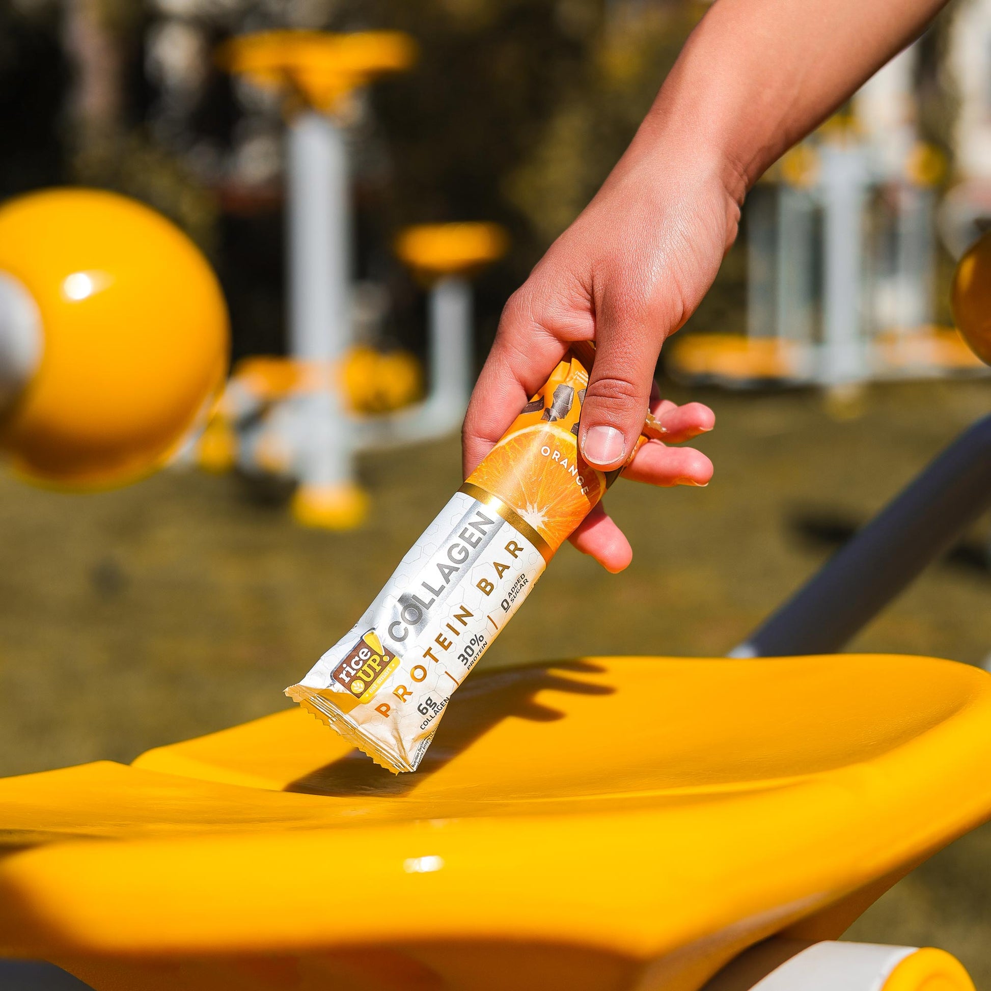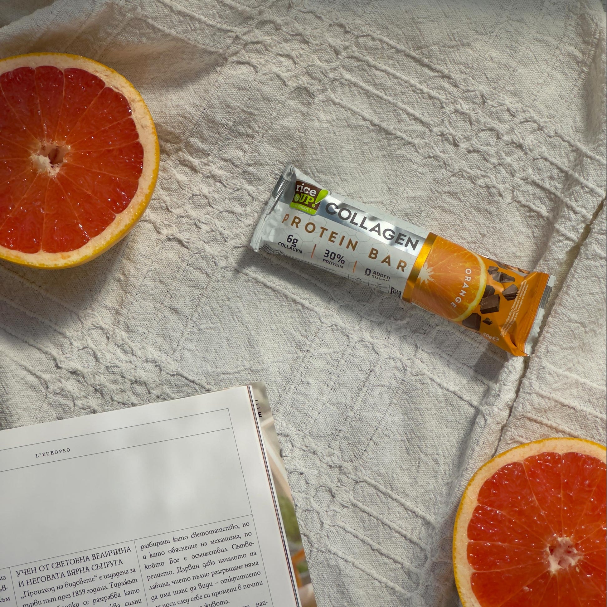 RiceUP! The collagen bar is a new generation functional dessert that does not compromise on taste and fits under 215 calories, making it the ideal snack for those who monitor their calorie intake. It is a magical combination of textures, flavor, and functionality that promises delight with every bite! It combines a gentle protein (milk) filling with an orange flavor, a layer of fresh orange cream, with no added sugar, and fine cocoa crisps, wrapped in real milk chocolate, without palm oil. The collagen bar contains 6000mg of hydrolyzed beef collagen type I and III. Collagen is the key component in RiceUP! Collagen Protein Bar.