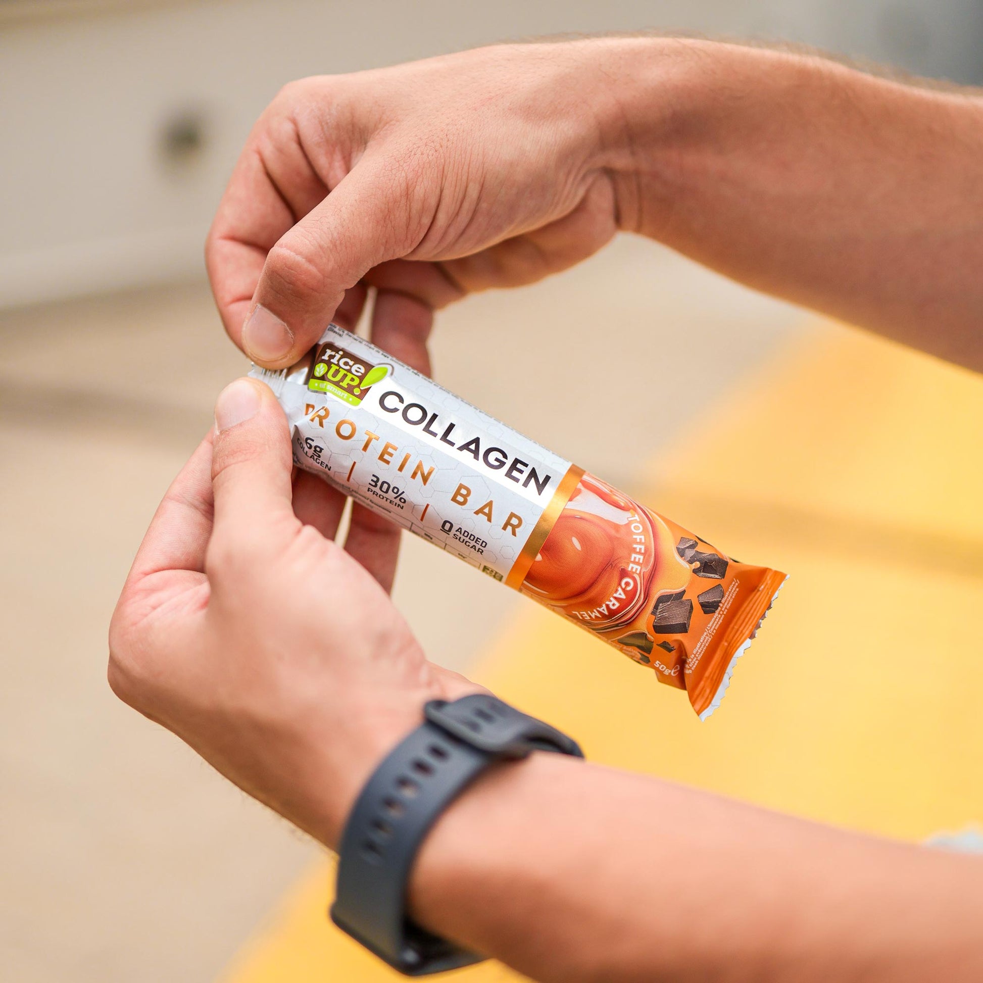 RiceUP! Collagen bar is the right choice for a healthy and tasty dessert for the afternoon coffee or as a quick snack at work, at school, during travel, or after training, because it contains no added sugar, gluten, palm oil, preservatives, artificial flavors, and sweeteners, and is rich in fiber, which further supports the digestive process.