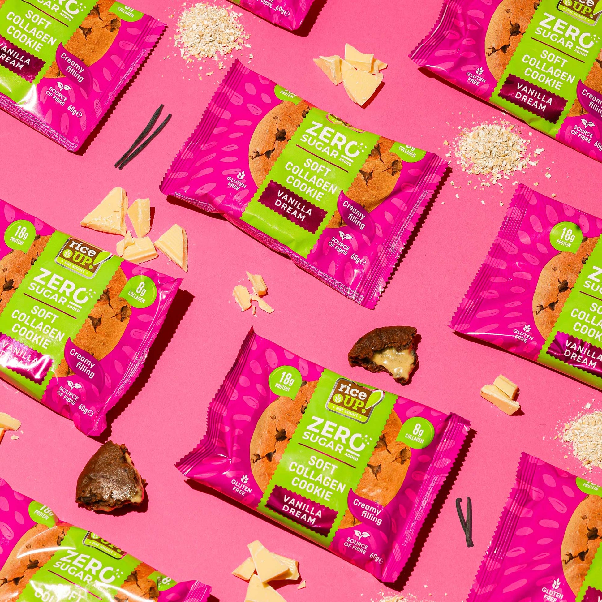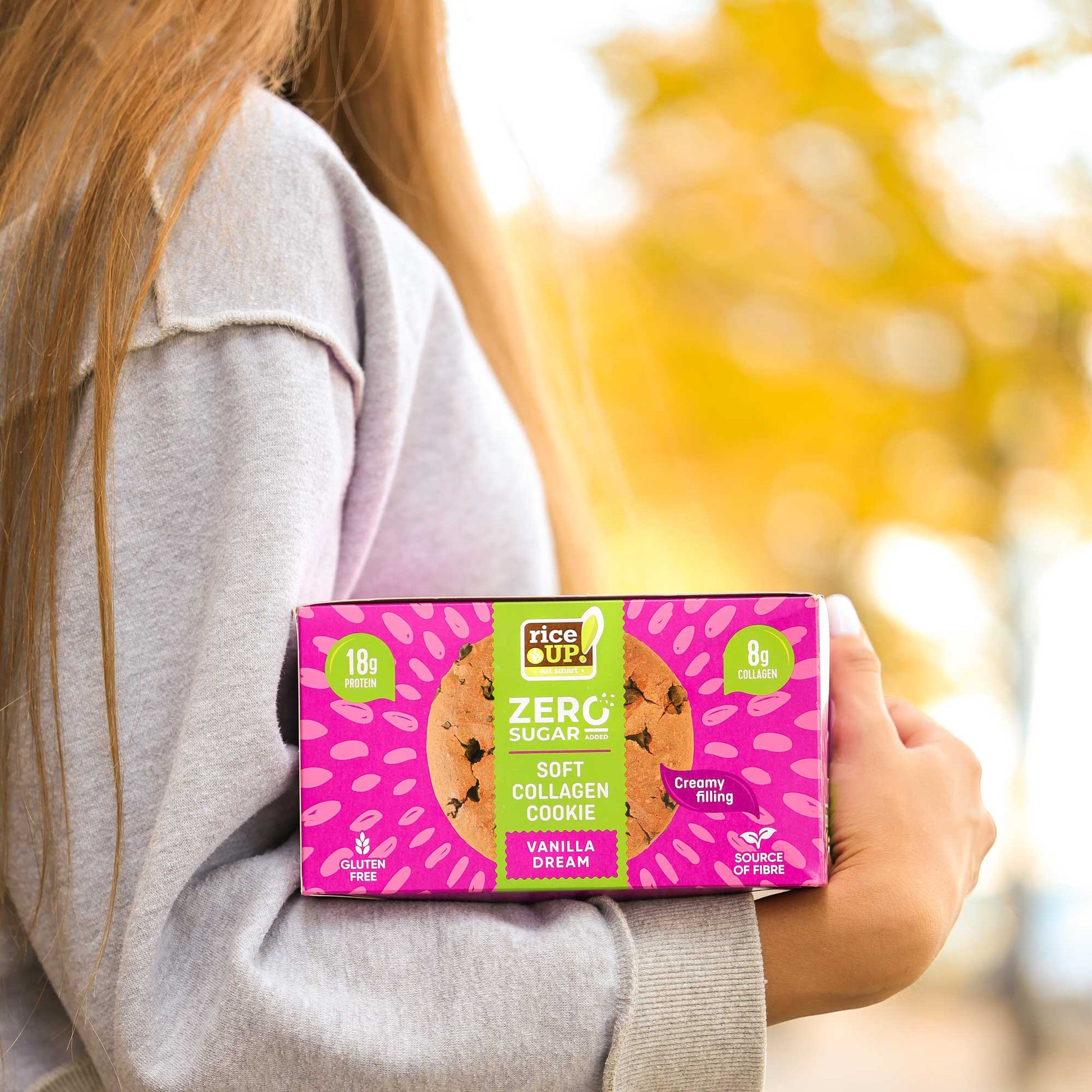 RiceUp! Collagen cookies are a revolutionary dessert from the new generation of functional products, without compromising on taste. It contains under 240 calories – ideal for those who monitor their calorie intake. Made entirely from gluten-free oats, with a soft texture and an abundance of chocolate chips and a core of delicate vanilla filling.