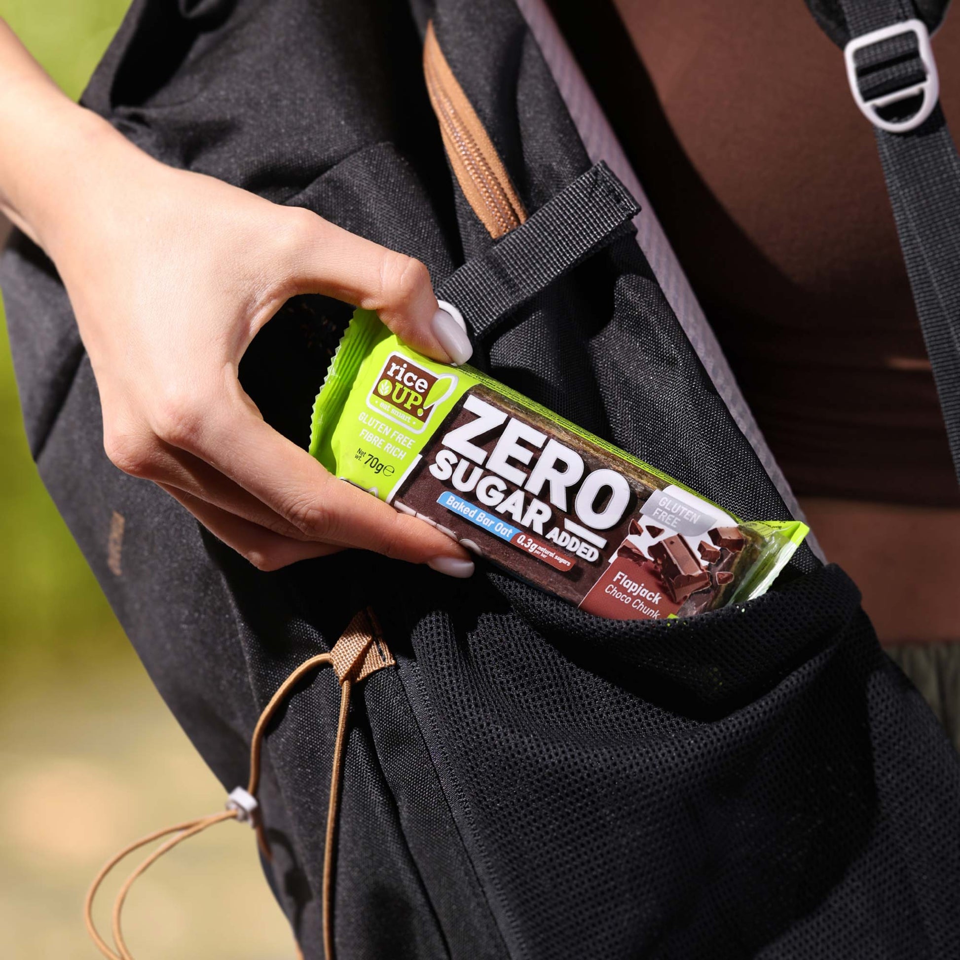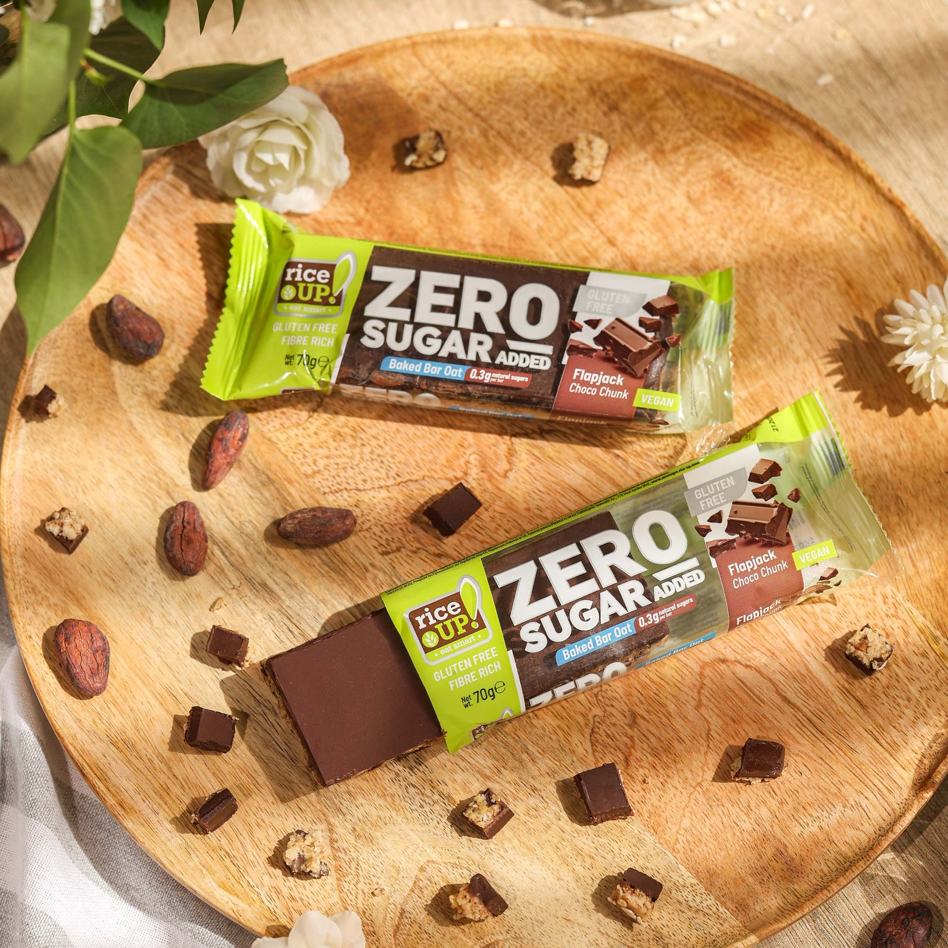 Chocolate couverture and chocolate pieces without added sugar on a dense oat base – an intense true cocoa flavor, chewy texture, and smooth energy that lasts long.