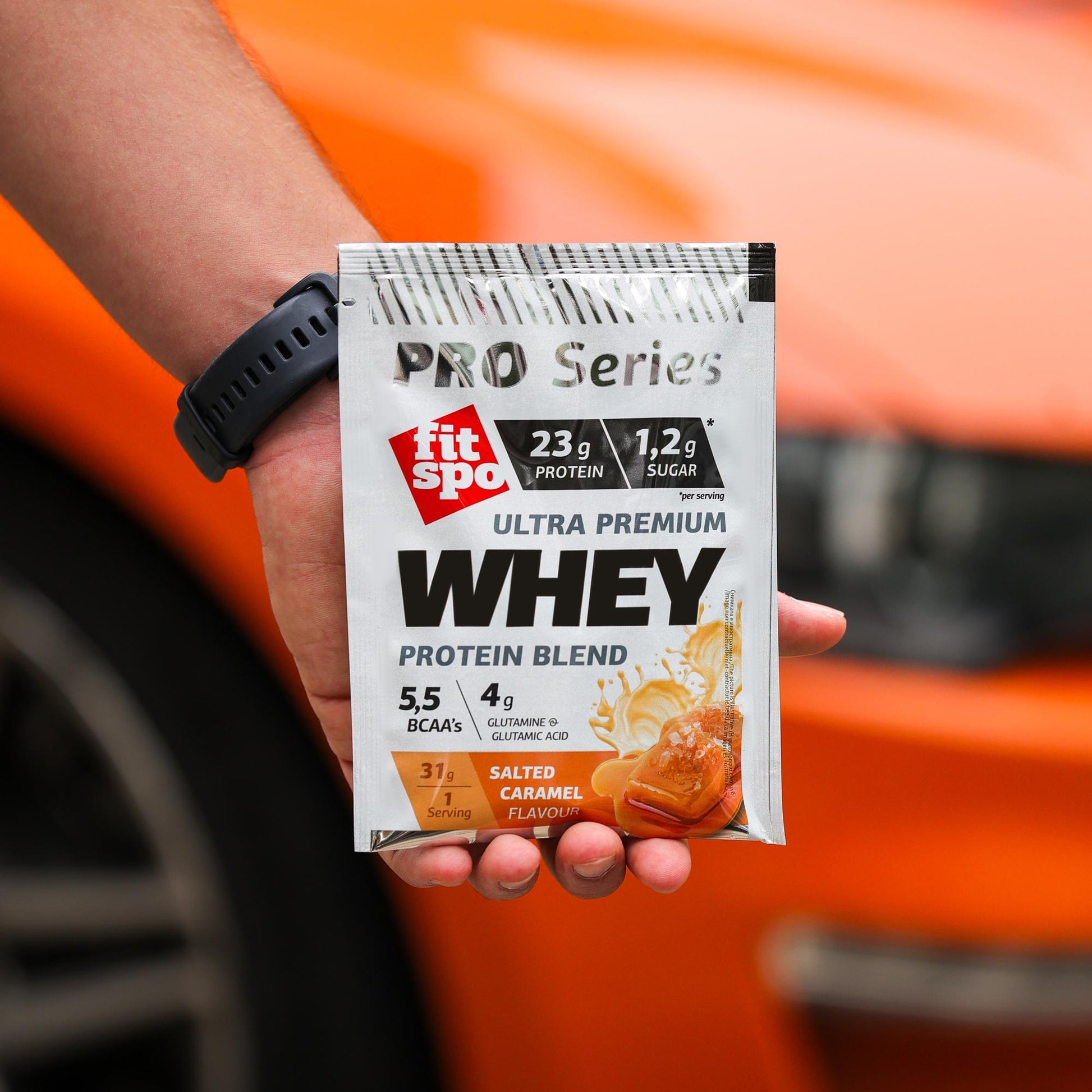 FitSpo Salted Caramel whey protein powder is easily soluble, flavorful, and has a creamy texture, making it a nutritional shake that allows you to control your calorie intake and replace a meal. The protein powder contains no dry milk, is rich in protein, and is developed only with natural flavorings and colorings. A delicious, quick, and complete meal replacement. Preparation time – 30 seconds! One package contains 12 single servings.
